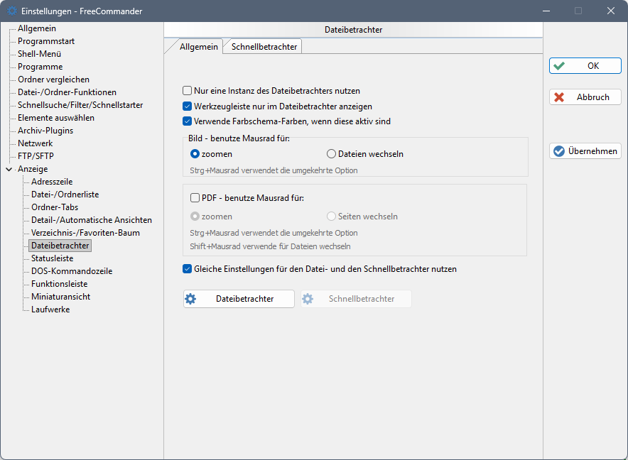 Wenn diese Option nicht angehakt ist, werden die Einstellungen getrennt in den Schaltflächen "Dateibetrachter" und "Schnellbetrachter" definiert.