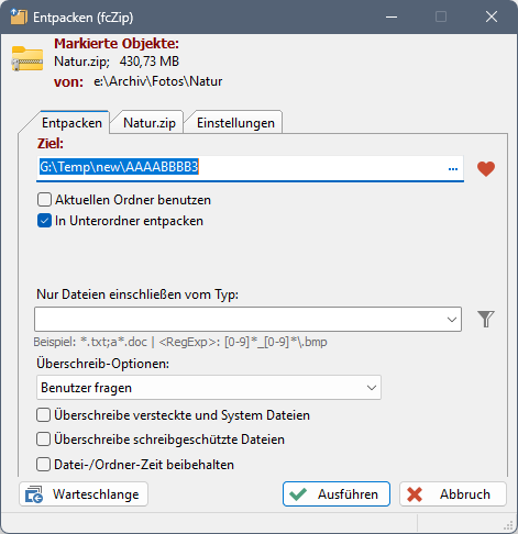 Durch den Inhalt des Eingabefeldes "Nur Dateien einschließen vom Typ" kann die Anzahl der (aus den markierten Archivdateien) zu entpackenden Elemente reduziert (gefiltert) werden. Im Eingabefeld können Wildcards und reguläre Ausdrücke verwendet werden.