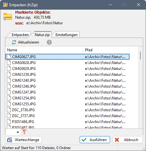 wird der Entpackvorgang in die Warteschlange eingefügt und die Abarbeitung der Warteschlange wird gestartet. Der Dialog "Warteschlange" kann mit der Schaltfläche