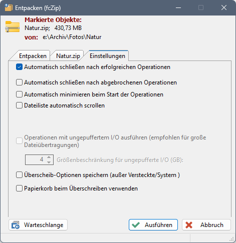 Wenn die Schaltfläche "Abbruch" aktiviert wird, wird der Entpackvorgang (dieser und aller weiteren "Konfliktdateien") abgebrochen. Alle bereits erfolgten Entpackvorgänge bleiben erhalten (alle "konfliktfreien" Entpackvorgänge und das Entpacken aller Dateien, für die Konflikte vorher manuell entschieden wurden). - Weitere Einstellungen