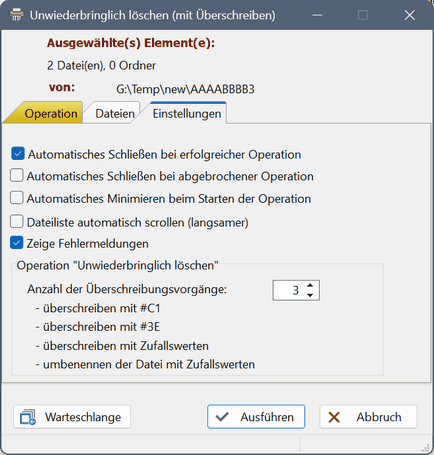 Im Eingabefeld "Anzahl Überschreibungsvorgänge" kann definiert werden, wie oft die nachfolgend genannten Schritte durchlaufen werden sollen. Ganz sicher unwiederbringlich gelöscht ist eine Datei ab 32 Überschreibungsvorgängen.