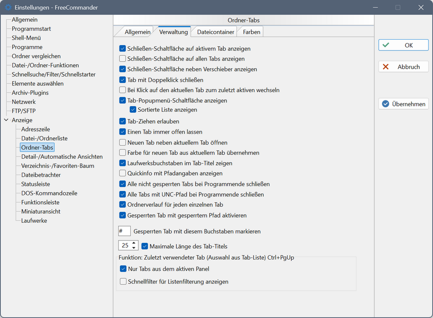 Unter "Extras → Einstellungen → Anzeige → Ordner-Tabs" können im TAB "Verwaltung" folgende Einstellungen konfiguriert werden:
