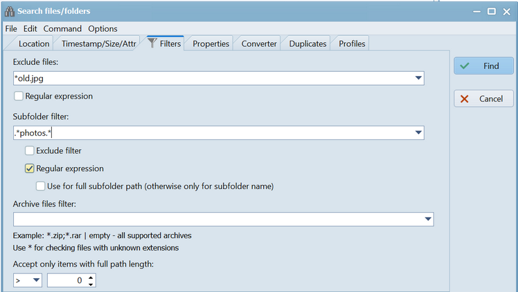 This option can be activated only if "Using regular expressions" is active. If this option is checked, the content of the field "Subfolder filter" is interpreted as a full subfolder path, otherwise only as a subfolder name. See examples of the effects under "Examples to search in (sub-) folders".