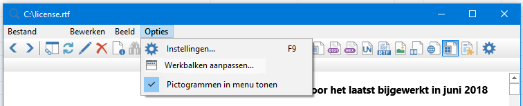 Na activeren van dit menu-item wordt de weergave van pictogrammen voor elk FreeCommander-Viewer-menu-item in-/uitgeschakeld. Bij ingeschakelde optie staat voor het menu-item het teken