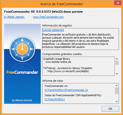Haciendo clic en "by Marek Jasinski" puede enviarse un email a la dirección "info@freecommander.com" haciendo uso del cliente de correo instalado en el ordenador.