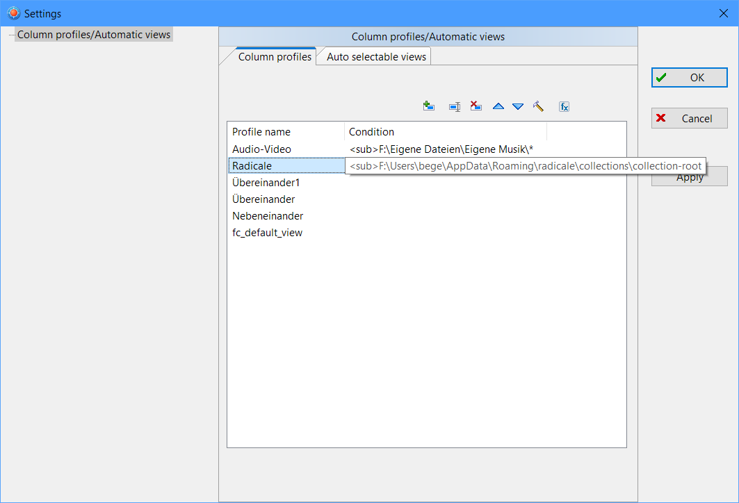 I have defined these conditions for column profiles with two conditions to be applied for certain folders and their subfolders.