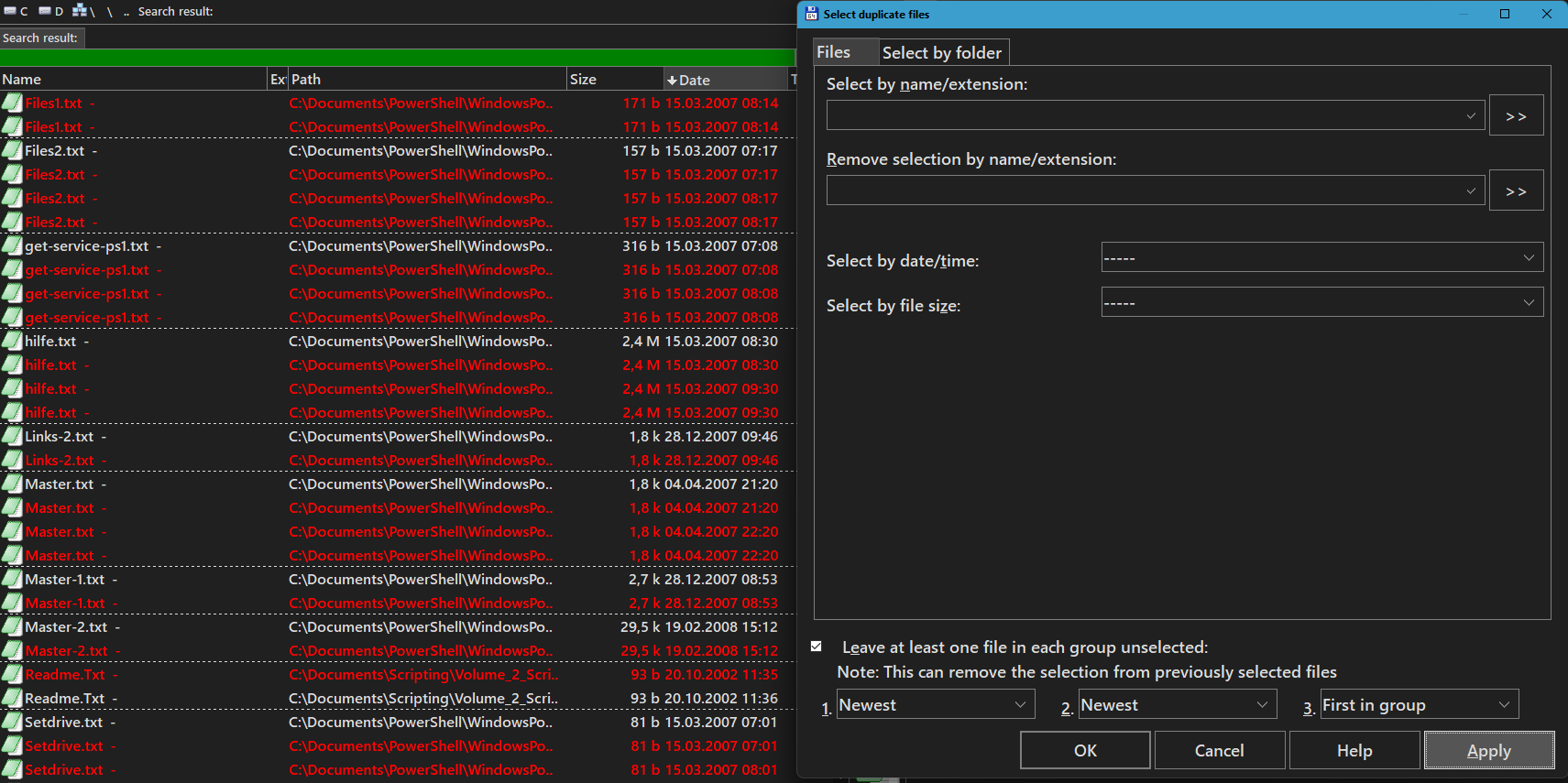 If you use the search for Duplicates you have much more than three criteria to detect duplicates.uroshnor wrote: 30.11.2021, 07:16 ...However, that leaves me with several hundred duplicate pairs that have the same size, creation and modification dates (but may or may not have the same filename). The problem is that the Duplicates Selection button only gives you options to select a duplicate for only those three criteria. How do you select duplicates when they have the same size, creation and modification dates?