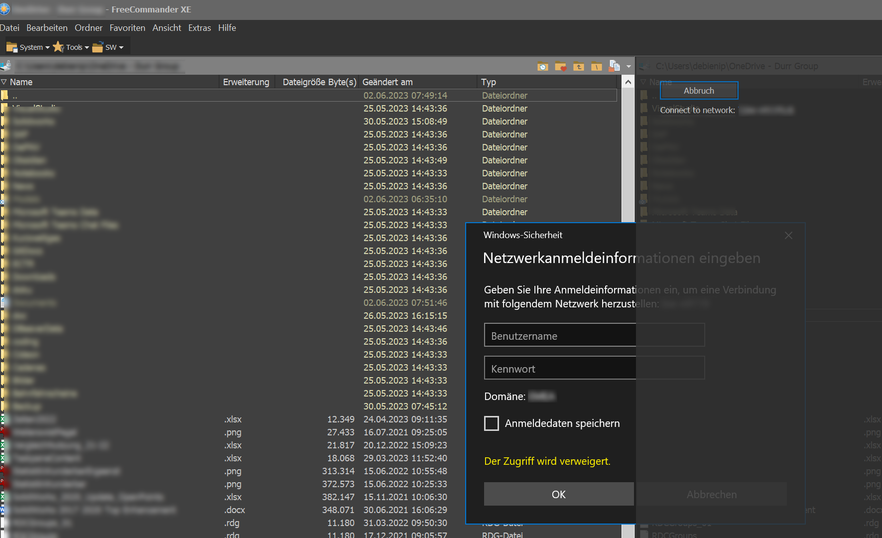 Unfortunately, this pops up just after a few seconds and interrupts the legetimation dialog (to enter once credentials). This is annoying as the creadentials have to be typed in twice. If using Keepass the autotype process is also interrupted. In a worse case, the {ENTER} comming from Keepass trigers the "Cancel" (Abbruch) button which appears on the overlay and has focus at this moment. This leeds to a login without changing the path and hence the address has to be typed in again using ALT+G.