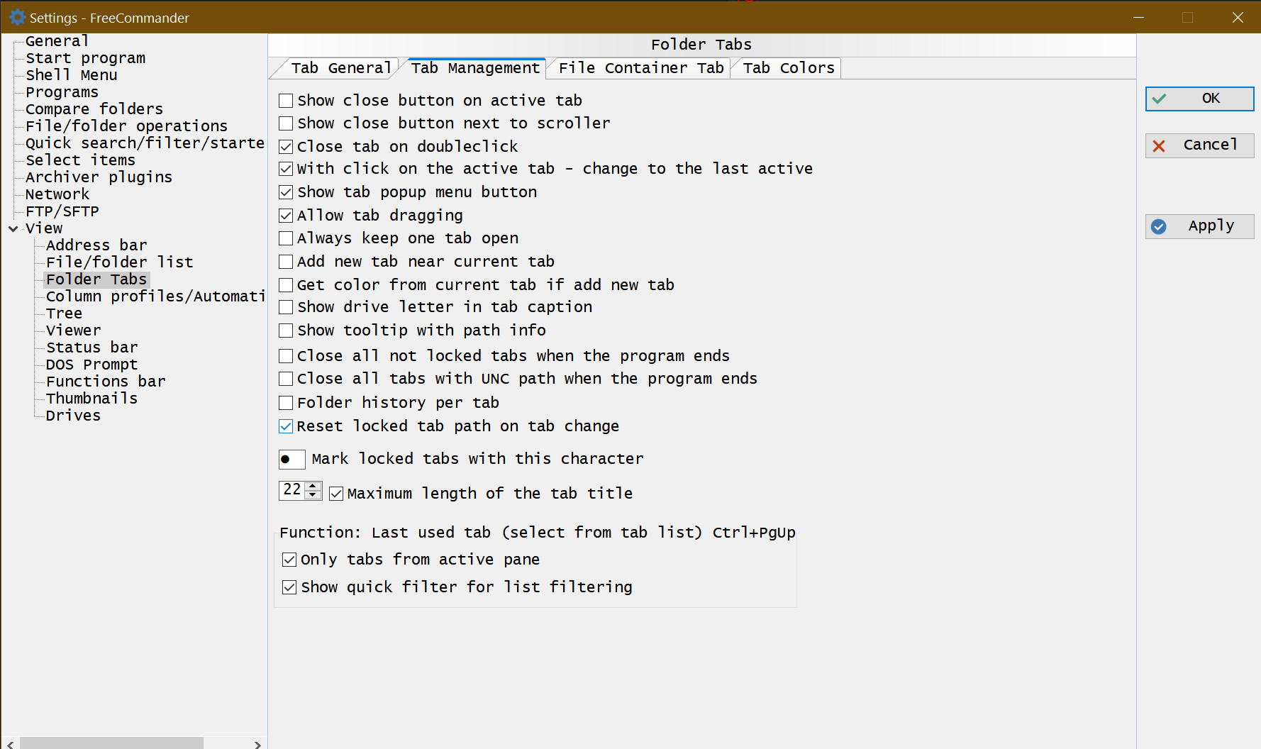 I did not saw and still do not see the supposed "Last used tab" optionKarol wrote: 16.12.2023, 21:27Tools-Settings-Folder Tabs: Tab Management tab- Implemented: New options for "Tab Management" added. Function "Last used tab (Ctrl+PgUp)" is configurable with: "Only tabs from active pane" and "Show quick filter for list filtering"