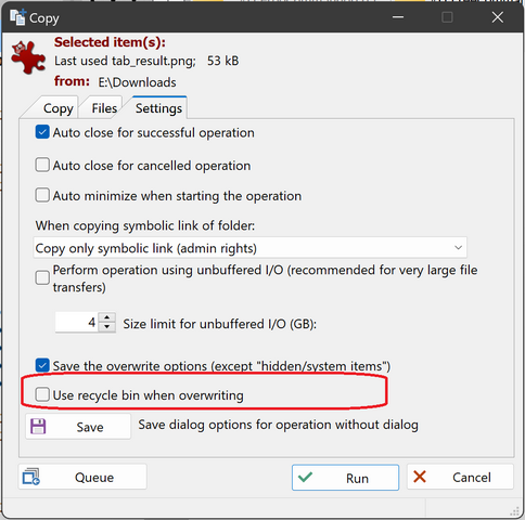 Strange, also with default settings? I tested with default settings and it's there, Copy dialog, Settings tab, last option above the Save button.Forez wrote: 17.12.2023, 00:07I saw and still do not see the supposed "Use recycle bin when overwriting"