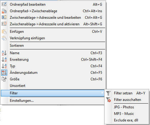 Die Menüpunkte der Gruppe "Sortierung" entsprechen denen des Menüpunkts "Extras → Einstellungen → Anzeige → Datei-/Ordnerliste" im Tab "Sortierung nach" und sind dort beschrieben. - Filter