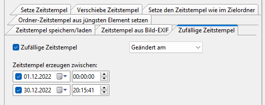 Wenn die Option "Zufällige Zeitstempel" angehakt ist, erhalten alle im TAB "Dateien" gelisteten Dateien und Ordner zufällige Zeitstempel, die innerhalb der Grenzen liegen, die von den Feldern "Zeitstempel erzeugen zwischen" gebildet werden. Folgende Zeitstempel können gesetzt werden: