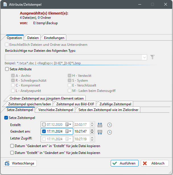Alle im TAB "Dateien" gelisteten Dateien und Ordner erhalten die hier eingestellten Zeitstempel. Folgende Zeitstempel können gesetzt werden: