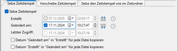 Wenn die Option "Verschiebe Zeitstempel" angehakt ist, sind die Optionen "Setze Zeitstempel" und "Setze den Zeitstempel wie im Zielordner" nicht aktiv.