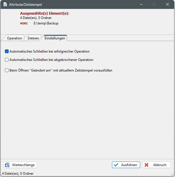 Wenn diese Option angehakt ist, wird der Attribute/Zeitstempel-Dialog automatisch geschlossen, sobald alle Änderungsvorgänge erfolgreich abgeschlossen sind.