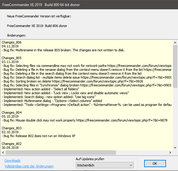 Wenn der Link "Vollständige Liste der Änderungen" aktiviert wird, öffnet sich die FreeCommander-Online-Seite mit allen Versionen und ihren Änderungen.