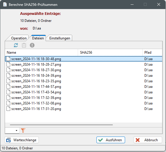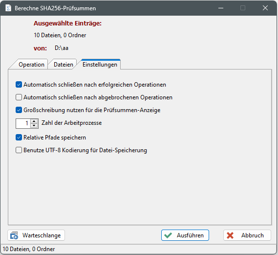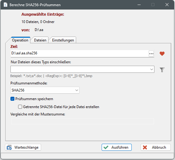 wird der Vorgang der Berechnung der Prüfsummen aller Dateien des TABs "Dateien" in die Warteschlange eingefügt und die Abarbeitung der Warteschlange wird gestartet. Der Dialog "Warteschlange" kann mit der Schaltfläche