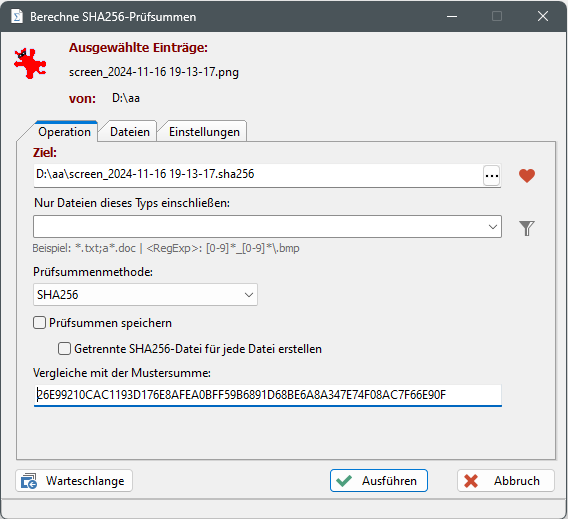 Wenn die Prüfsumme einer Datei (z.B. aus einem Download) bekannt ist, kann sie im Eingabefeld "Vergleiche mit der Mustersumme" eingetragen werden.