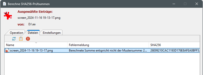 Wenn ein Fehler bei der Berechnung der Prüfsummen aufgetreten ist, wird zusätzlich die Spalte "Fehler" angezeigt und gefüllt.
