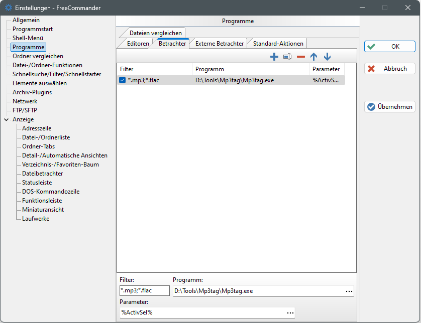 Im Eingabefeld "Programm" wird für die in der Liste markierte Zeile der Betrachter eingetragen, der die markierte Datei(en) aus dem aktiven Dateifenster zur Betrachtung öffnen soll.