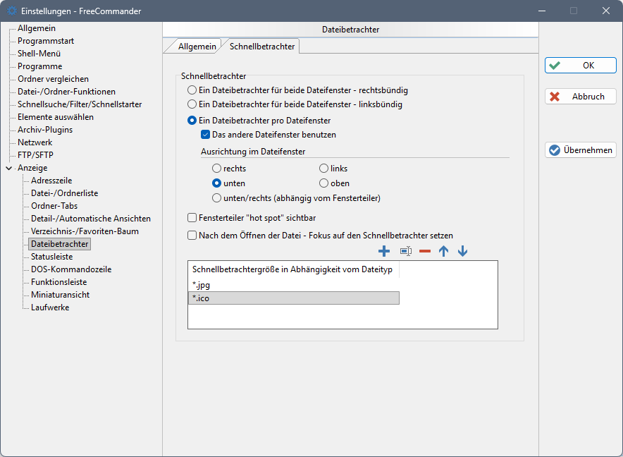 Unter "Extras → Einstellungen → Anzeige → Dateibetrachter" können Schnellbetrachter und Dateibetrachter konfiguriert werden.