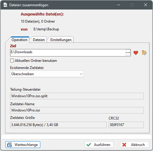 Unter "Existierende Zieldatei" kann festgelegt werden, was mit einer Datei im Zielordner geschehen soll, die namens-gleich mit der zusammengefügten Datei ist.