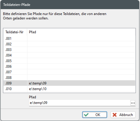 erscheint ein Dialog in dem für jede Teildatei definiert werden kann in welchem (vom "von" Pfad abweichenden) Pfad sie gefunden wird. Im Eingabefeld Pfad kann dort der Pfad für die hervorgehobene Teildatei eingegeben werden, oder über die Schaltfläche