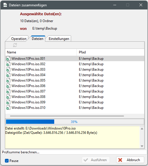 Anschließend muss im Dialog "Dateien zusammenfügen" im TAB "Operation" mit der Schaltfläche