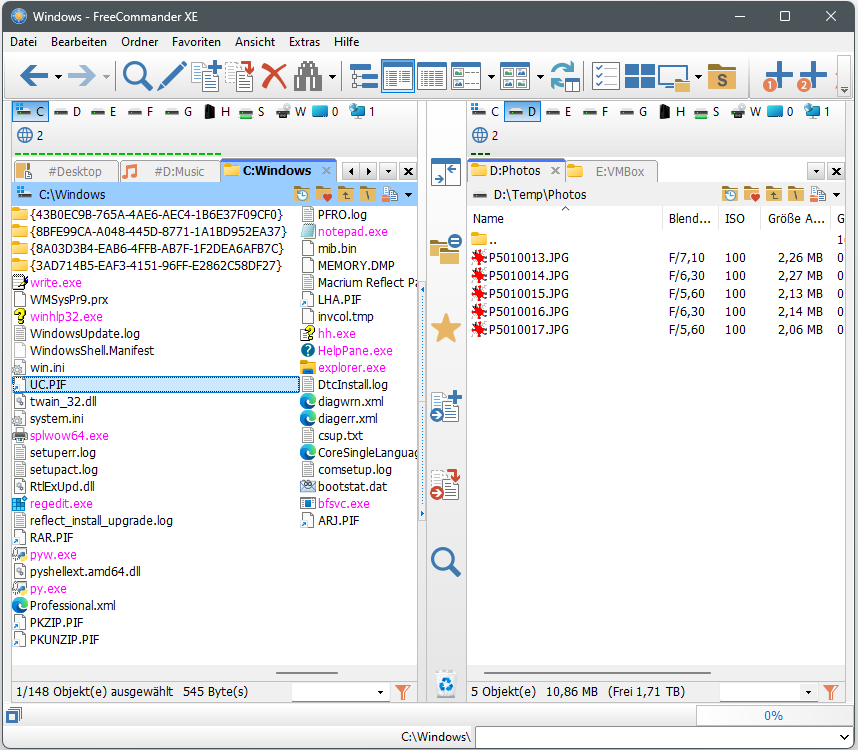- Wenn aktuell ein Dateifenster dargestellt wird, wird auf die Darstellung von zwei Dateifensters gewechselt: