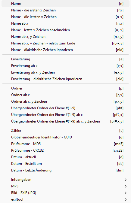 neben dem Eingabefeld lässt sich ein Platzhalter aus einem Drop-Down-Menü auswählen und an der aktuellen Cursor-Position in das Eingabefeld einfügen. Platzhalter stehen immer in eckigen Klammern "[]". Alle Platzhalter werden bei der Bildung eines neuen Namens ausgewertet und anschließend durch eine Zeichenkette ersetzt. Alle anderen Zeichen (ohne eckige Klammern) werden ohne Änderungen im neuen Namen platziert. Folgend Platzhalter stehen zur Verfügung: