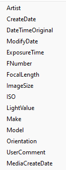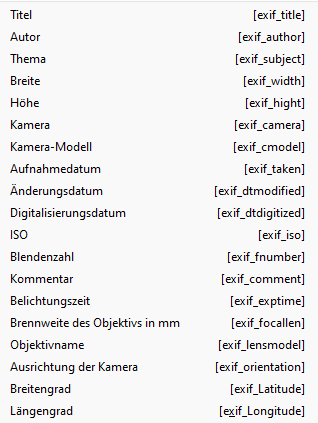 Wenn das Programm exiftool.exe installiert ist und unter "Extras → Einstellungen → Anzeige → Dateibetrachter" im Tab "Metadaten/Exif" sein Pfad definiert ist, stehen für alle Dateien/Ordner mit Exif-/Metadaten (über Exiftool ermittelte) Platzhalter zur Auswahl.