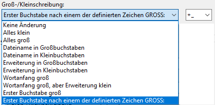 Nach Klick auf das Kombinationsfeld "Groß-/Kleinschreibung" und Auswahl einer Option, kann eingestellt werden, wie sich die Bildung der neuen Namen der Elemente bezüglich Groß-/Kleinschreibung verhält. Dabei stehen folgende Optionen zur Auswahl: