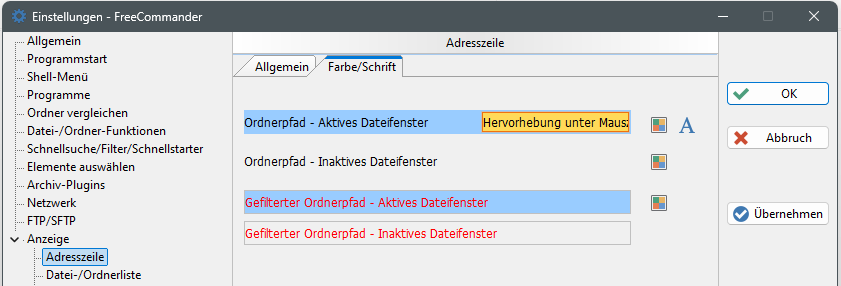 kann die Schriftfarbe in der Adresszeile des aktiven und des inaktiven Dateifensters bei aktivem Filter eingestellt werden.
