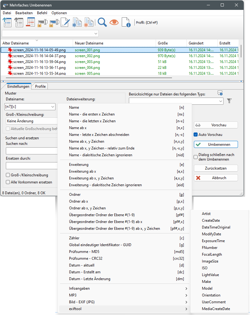 Alle angehakten Spalten werden angezeigt. Beim Speichern von Profilen werden die angehakten Spalten mitgespeichert. Damit kann im Dialog "Mehrfaches umbenennen" schnell zwischen Spaltensets gewechselt werden.