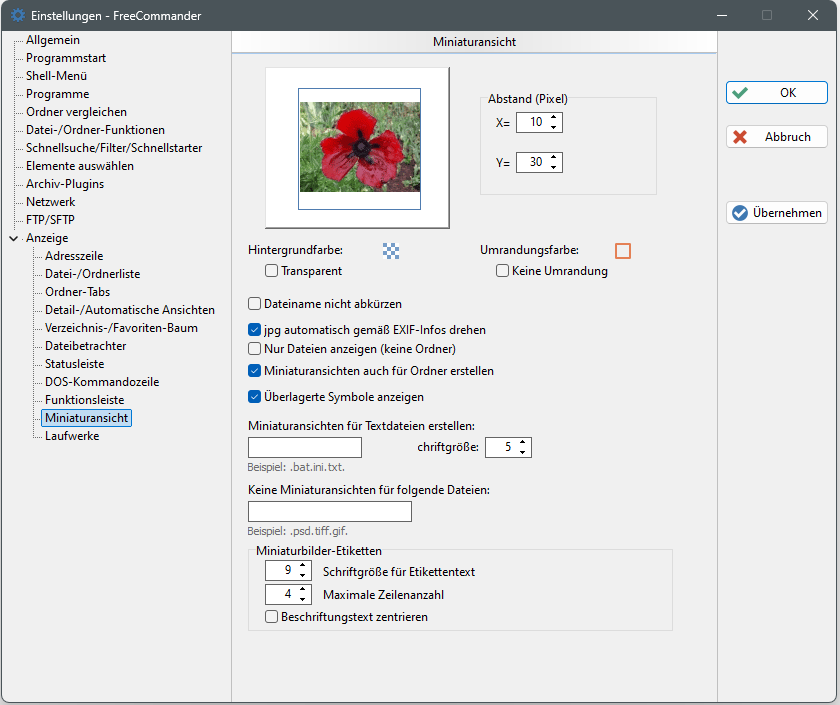In dieser Einstellung kann definiert werden, dass der Textanfang von Textdateien (deren Dateityp im Eingabefeld erfasst ist) in der Miniaturansicht dargestellt wird. Beispiel für die Eingabe der Dateitypen: ".bat.ini.txt".