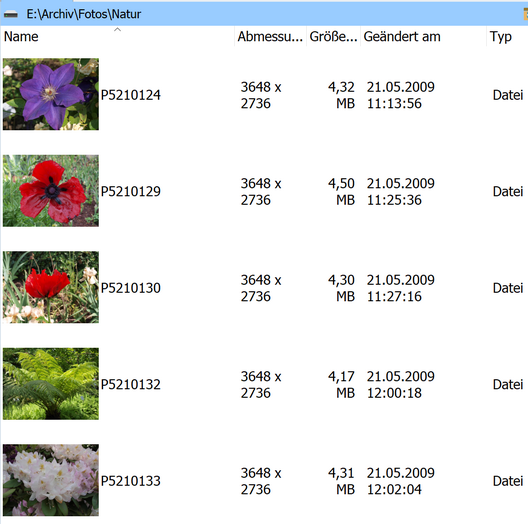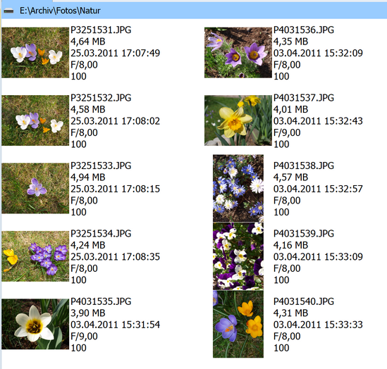 Nach Aktivierung des Untermenüpunktes "Miniaturbilder-Liste" oder der Tastenkombination "Alt+L" werden die Elemente im aktiven Dateifenster mit der Ansichtsart "Miniaturbilder-Liste" dargestellt. Dabei werden Spalteninhalte neben dem Miniaturbild in Zeilen dargestellt. Ein Spalteninhalt pro Zeile.