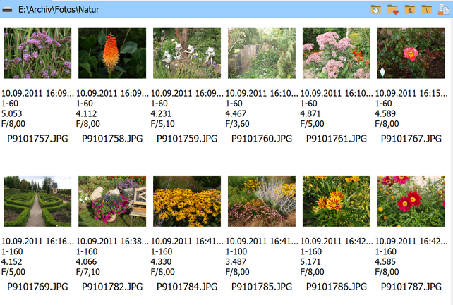 Nach Aktivierung des Untermenüpunktes "Miniaturbilder-Etiketten" oder der Tastenkombination "Alt+B" werden die Elemente im aktiven Dateifenster mit der Ansichtsart "Miniaturbilder-Details" dargestellt. Dabei werden unterhalb des Miniaturbildes die Spalteninhalte in Zeilen dargestellt.