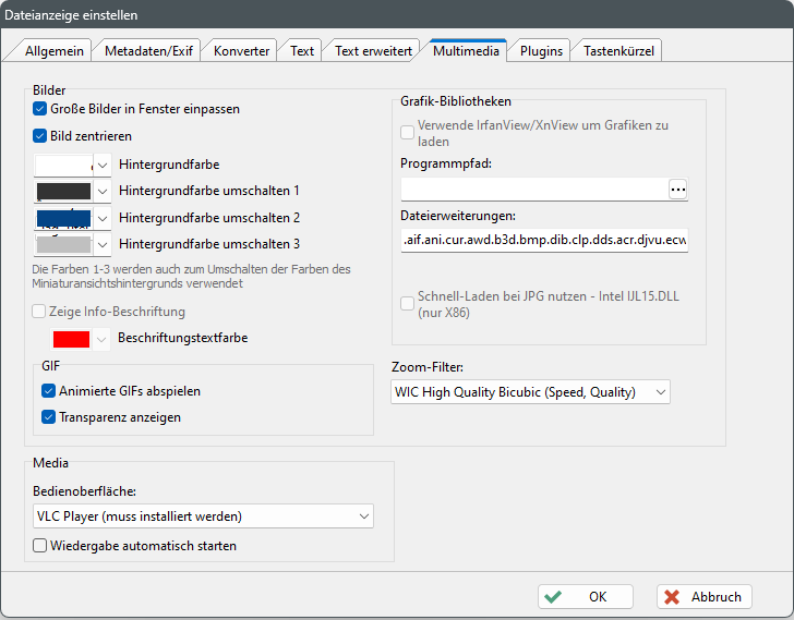 Unter "Extras → Einstellungen → Anzeige → Dateibetrachter" kann im Tab "Multimedia" für den Schnellbetrachter und/oder den Dateibetrachter die Darstellung von Bildern und Media im Betrachter konfiguriert werden.