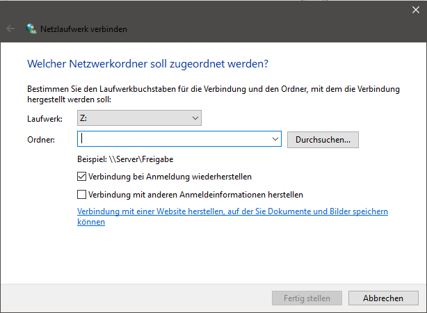 Mit dem Menüpunkt "Extras → Netzlaufwerk verbinden" oder dem Tastenkürzel (Hotkey) "Strg+F11" kann die Verbindung mit Netzwerklaufwerken oder Netzwerkordnern hergestellt werden.