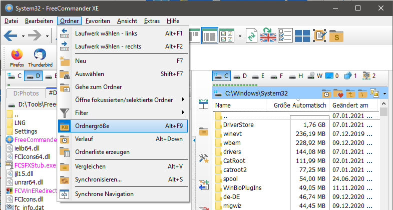 Nach Aktivierung des Menüpunktes "Ordnergröße" oder der Tastenkombination "Alt+F9" wird die Ermittlung und Anzeige der Ordnergröße in der aktiven Dateiliste aktiviert, bzw. deaktiviert.
