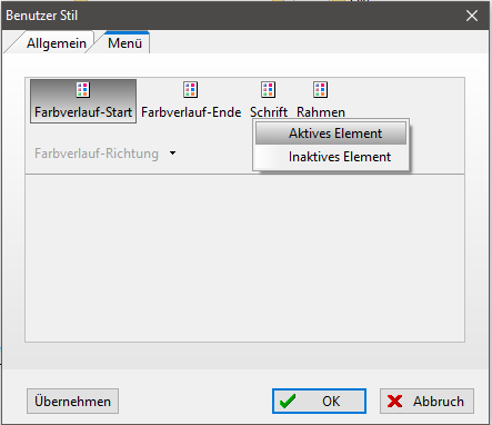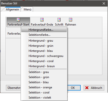Im Fenster "Benutzerstil" können im TAB Menü folgende Farbeinstellungen für die Menüs definiert werden: