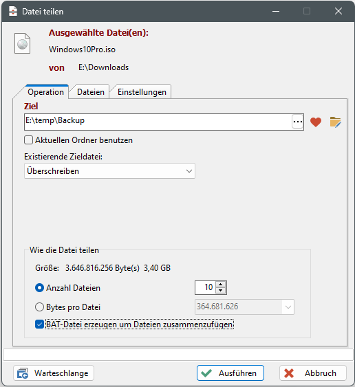 " können (änderbare) Vorschläge für größere Dateigrößen in das Eingabefeld übernommen werden. - BAT-Datei erzeugen um Dateien zusammenzufügen