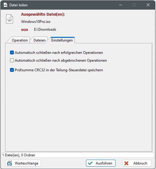 Wenn diese Option angehakt ist, wird die CRC32-Prüfsumme der zu teilenden Datei in die Teilungs-Steuerdatei geschrieben um den Erfolg der Funktion "Dateien zusammenfügen" zu prüfen.