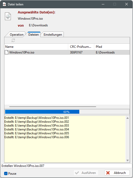 wird der Teilungsvorgang gestartet. Damit ändert sich der Dialog "Datei teilen" in folgenden Punkten: