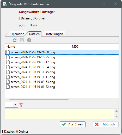 Im Fenster "Überprüfe MD5-Prüfsummen" befindet sich unten die Hinweiszeile "... Dateien, ... Ordner", mit dem Hinweis wie viele Dateien zu prüfen sind. Beim Öffnen des Fensters ist die Zeile nicht sichtbar. Immer wenn der TAB "Dateien" (oder die Schaltfläche "Ausführen") aktiviert wird, werden die zu prüfenden Dateien geladen und ihre Anzahl wird angezeigt.