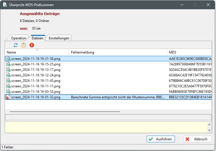 Im Dialog "Verifiziere Prüfsummen" kann z.B. überprüft werden, ob sich seit der Erstellung der Prüfsummendatei (in der Datei gelistete) Dateien geändert haben.