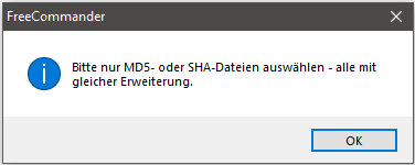 Wenn bei der Aktivierung der Funktion auch Dateien mit anderen Erweiterungen als "MD5"oder "SHA..." markiert sind, erscheint die Fehlermeldung "Bitte nur MD5 oder SHA-Dateien auswählen":