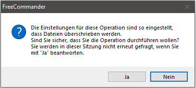 Wenn die Verschiebeoption (im Dialog "Verschieben" der Funktion "Datei →Verschieben mit Rückfrage") so eingestellt wurde, dass manche Dateien ohne Warnung überschrieben werden und die Optionen für Operationen ohne Dialogfenster gespeichert wurden, erscheint bei der ersten Verwendung der Operation folgende Meldung: