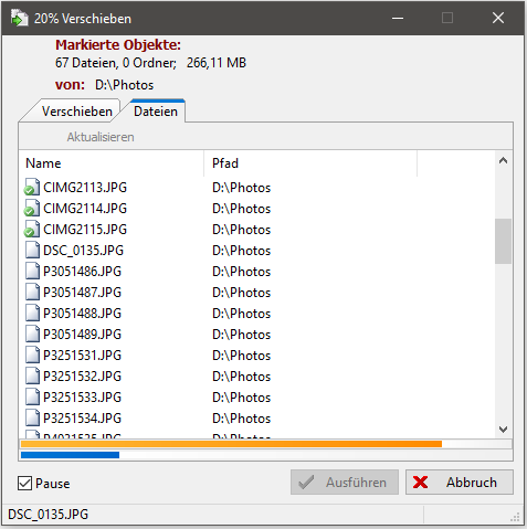 Nach Auswahl dieser Option werden die zu verschiebenden Dateien umbenannt in den Zielordner verschoben. Im Zielordner bleibt die Originaldatei erhalten.