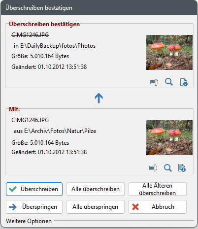 Wenn die Schaltfläche "Überschreiben" aktiviert wird, wird die unter ("Überschreiben bestätigen") angezeigte Datei mit der (unter "Mit") angezeigten Datei überschrieben.
